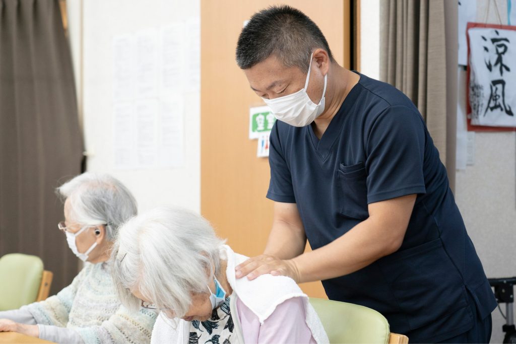バイタルチェックが終わった方から、利用者個々の介助方法にて心身ともにリフレッシュしていただきます。